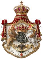 Coat of arms ensigned with a representation of the royal and imperial crown of the Sovereign Imperial and Royal House Ghassan on Or with rubies, blue sapphires and pearls, purple velvet and ermine wreath. Supported by a Lion Rampant (representing: Arabia ('Banu Azd' or "the Children of the Lion"), and an Arabian Horse Rampant